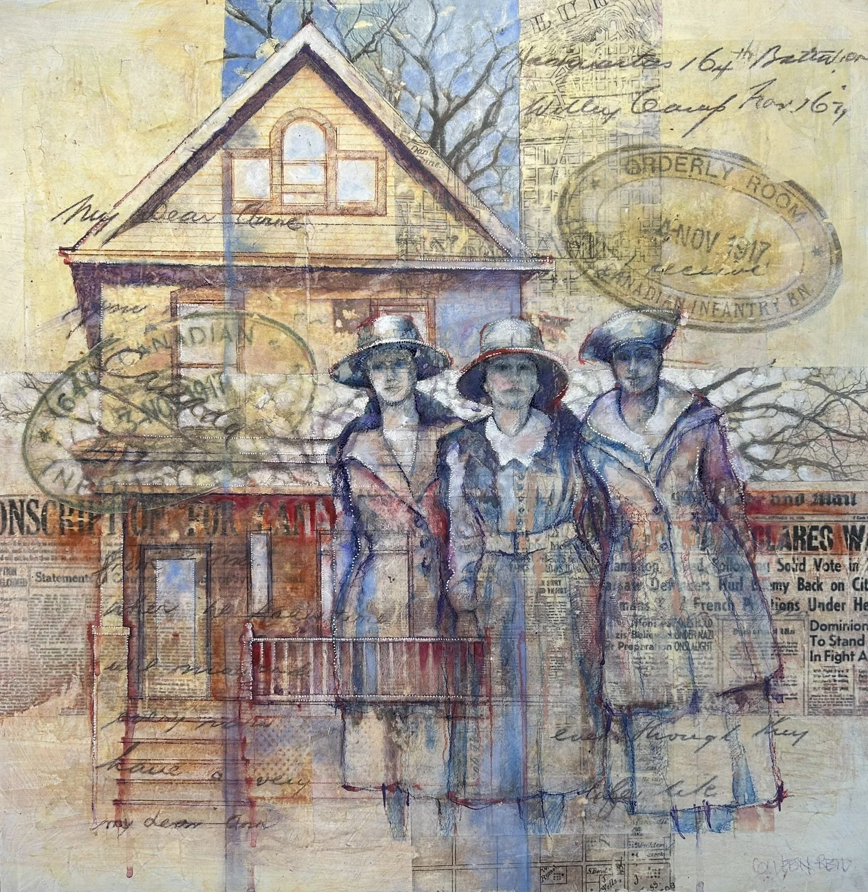 24” x 24” Mixed Media (Ink, pencil crayon, gel transfer, watercolour, rice papers) on wood panel. 2025